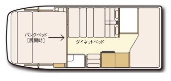 ベットサイズ:バンクベット 幅190㎝×奥190㎝ ダイネットベット 長さ180㎝×幅95㎝ 2段ベット 長さ190㎝×幅60㎝+頭部分10㎝