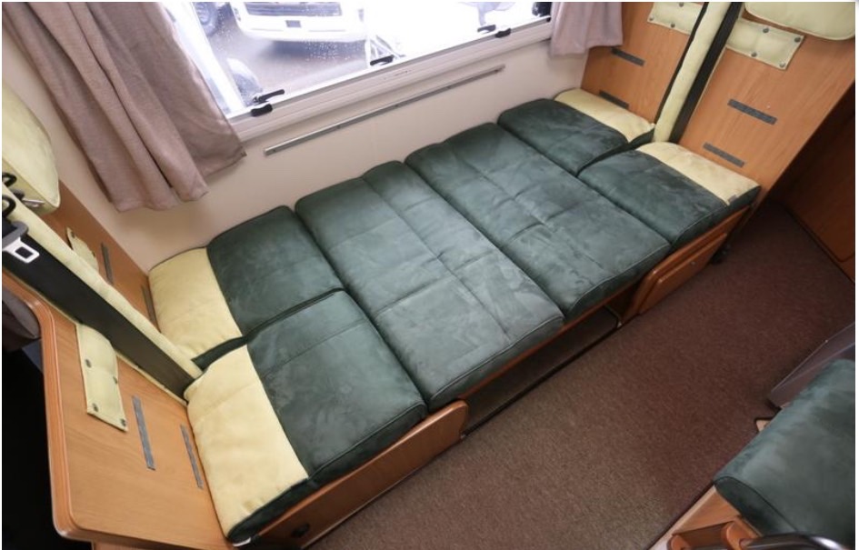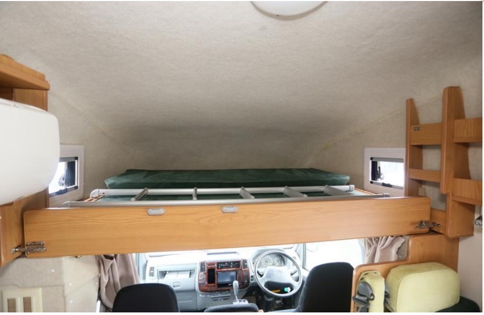 バングベットがスライド式です。収納時はセカンドシートに乗車している人の頭上を圧迫しません。バングベットに大人×3人 後部2段ベットに大人×2人 さらにダイネットをベットメイクすることで大人×1人 合計6人就寝可能です。乗車定員も7人なので、多人数での旅行も楽しめます。